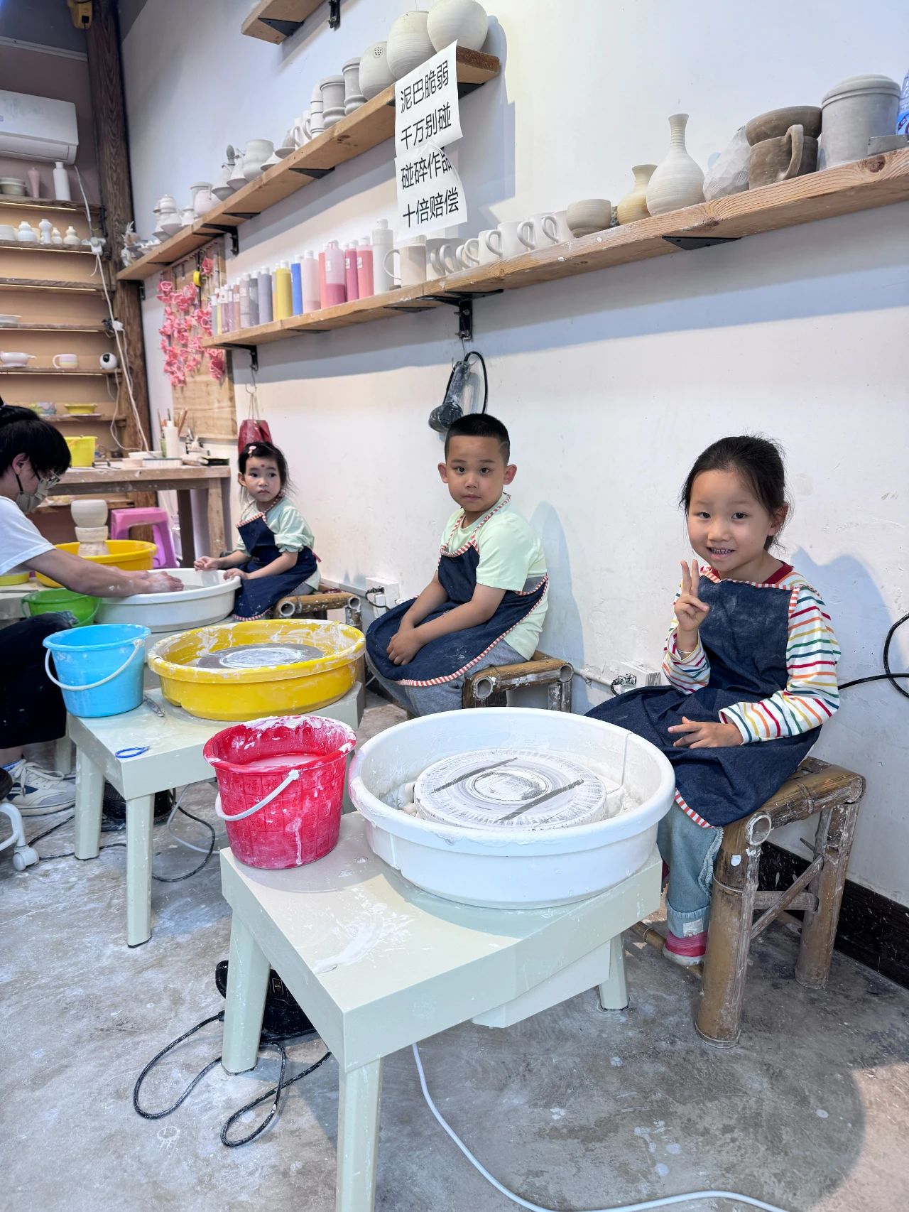 来到景德镇,怎能错过陶艺体验呢?小朋友们走进陶艺工作室,在专业老师的指导下,开启了一场与泥土的亲密接触。老师详细地讲解了陶瓷制作的历史和工艺,从陶泥的选择到拉坯、捏制、绘图等各个环节,都进行了耐心的示范。